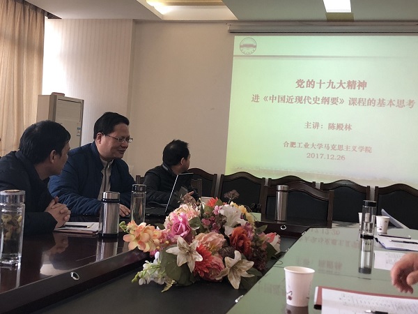 12月26日,由安徽省高校思政课教指委“纲要”组、中共淮南师范学院党委主办的新时代加强大学生党史教育论坛暨党的十九大精神进课程教学研讨会,在淮南师范学院召开。威尼斯官网“纲要”教研部老师在开展了党员活动日活动后,集体参加了论坛与会议。在下午举行的党的十九大精神进课程教学研讨会上,纲要教研部主任、安徽省思政课教指委委员、“纲要”组副组长陈殿林教授做了“党的十九大精神进《纲要》的思考”主旨报告。
