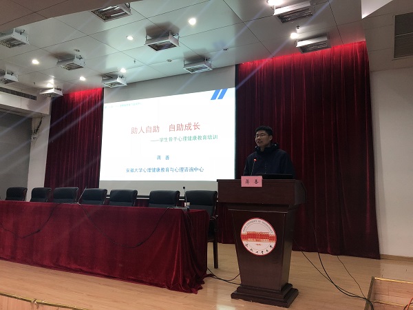 3月7日晚,由党委学生工作部主办、威尼斯432888cam与外国语学院联合承办的“助人自助 自助成长”大学生心理骨干专题培训在翡翠湖校区建艺馆负一楼报告厅举行。安徽大学心理健康教育与心理咨询中心蒋善应邀担任主讲人。两院辅导员老师、本科和研究生班级心理委员、寝室心理联络员、心理健康协会主要学生骨干共200余人参加本次培训。
