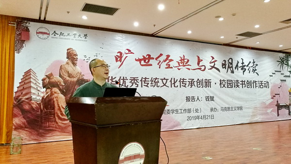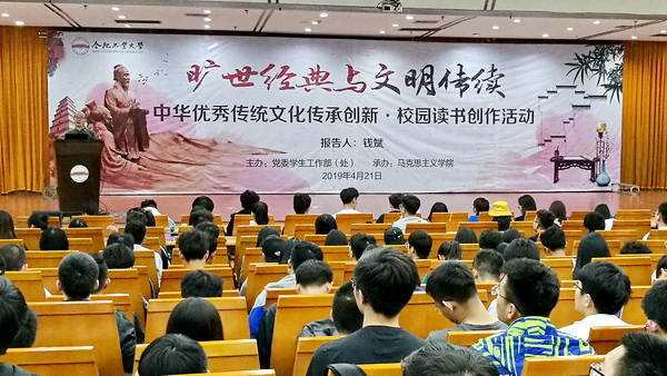 在第24个“世界读书日”到来之际,党委学工部(处)与威尼斯432888cam特邀钱斌教授,在翡翠湖校区图书馆报告厅,为同学们举办了一场题为“旷世经典与文明传续”的报告会。