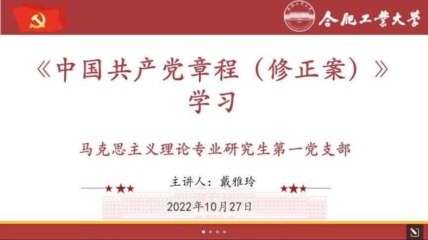 为深入学习贯彻马克思主义中国化时代化最新成果,增强支部全体党员的理论素养,马克思主义理论专业研究生第一党支部在10月27日晚,组织开展了以学习《中国共产党章程(修正案)》为主题的线上会议。本次会议由党支部书记孙军主持,党支部全体成员参会。